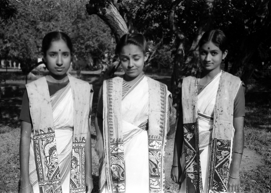 Three girl student at Shantiniketan photographed during their Majesties visit to the Institution on December, 1955.