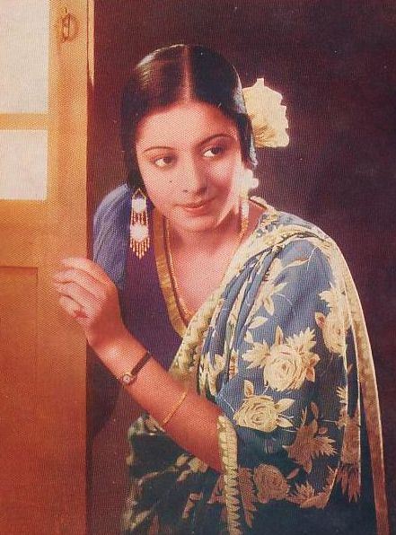 Kanan Devi, in a pretty blue, gold-edged blouse with a nicely coordinated sari. I love the quiet beauty of this picture. OK I really like Kanan Devi. Full stop.