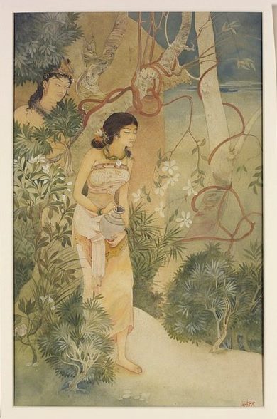 Though the depiction of Shakuntala varies and very rarely does she wear bark, in most cases the artist retains a simplicity of clothing given Shakuntala’s forest beginnings. As in this watercolour by Kshitindranath Majumdar which hews to the usual representation of a strapless bodice, a lower garment and a draping cloth.