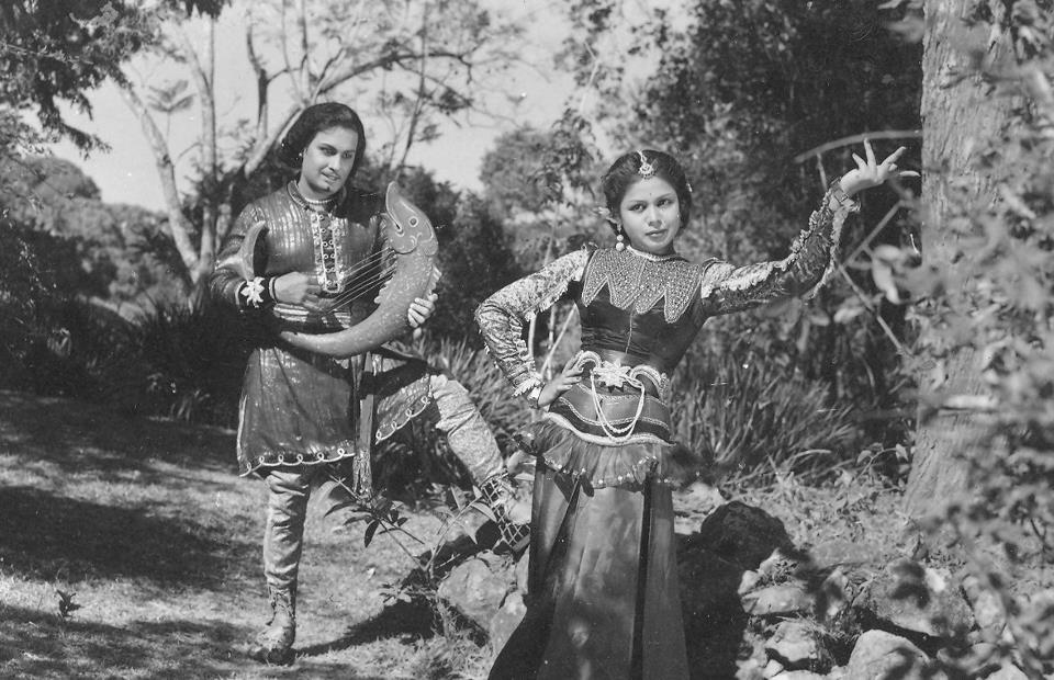 The full Madras cinema treatment (i.e. also not very accurate) for a film adaptation (Manthiri Kumari) of the Tamil Buddhist classic, Kundalakesi. The attire includes a short embellished tunic (with a good degree of frills) and a jewelled belt for the leading lady.