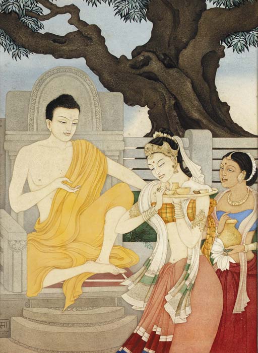 It is not often that you come across early 20th century Indian women painters but I can’t find much information on the artist. This seems to be from a 1950s series of paintings on the life of the Buddha and probably has to do with the episode of Amrapali serving food to the Buddha. Both she and her attendant wear an antariya, uttariya and cholaka (though the attendant has less finery and of course is a bit darker!).