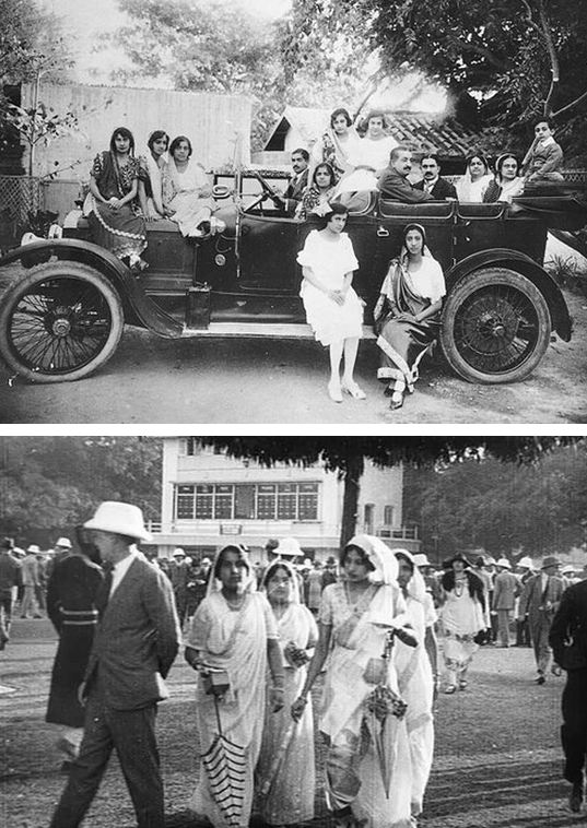 Saris in the 1920s on either side of the subcontinent 1) A Parsi family in 1925 Karachi and 2) A Calcutta Cup Race where “horses take second place to fashion” (from the film Calcutta Topical No 1-1925) . The pallu is worn over the head so often in this decade. Also still a lot of blouse. The sari drape – pic 1 is Parsi, pic 2 the version adapted in Bengal -varies, otherwise the look is similar.
