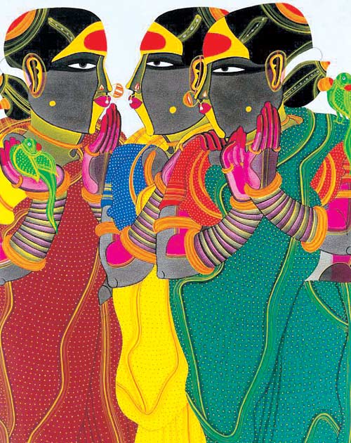 The vivid colours of Telengana – including turmeric and kumkum on the forehead – in Thota Vaikuntam‘s paintings.