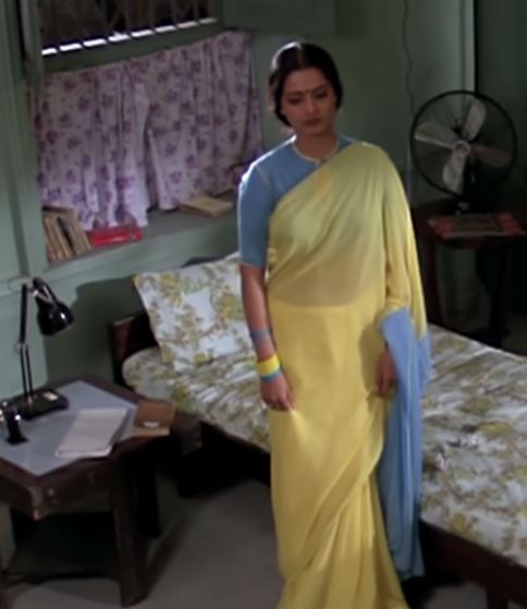 Another plain saree/polka dot blouse combo. The polka dots are almost invisible but they are there:) Note the watch – a staple back in time to denote the working woman. Also note the room decor – the basics of a lower middle class home.