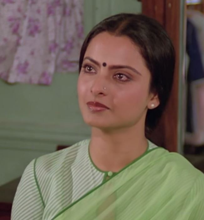 The hair is usually a plait with a sleek middle parting . But the at home scenes feature Rekha’s signature cloud of hair.