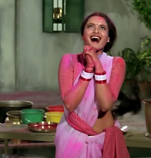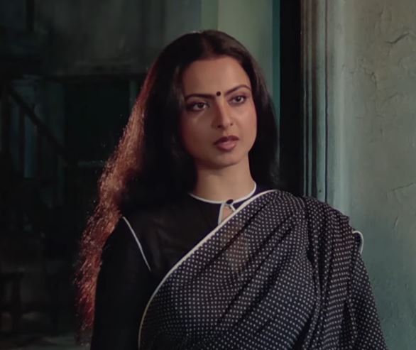 The template for Rekha’s sarees in the movies is a saree with a thin border/piping with the colours inverted for the blouse, which too has piping (in general you see a fair bit of piping in 1980s Rekha sightings). When it is the saree that is plain – as here – the pallu mirrors the polka dot blouse. The blouse remains more or less the same, high-necked with a keyhole fastened with a closure. All completely colour co-ordinated and usually employing two colours.